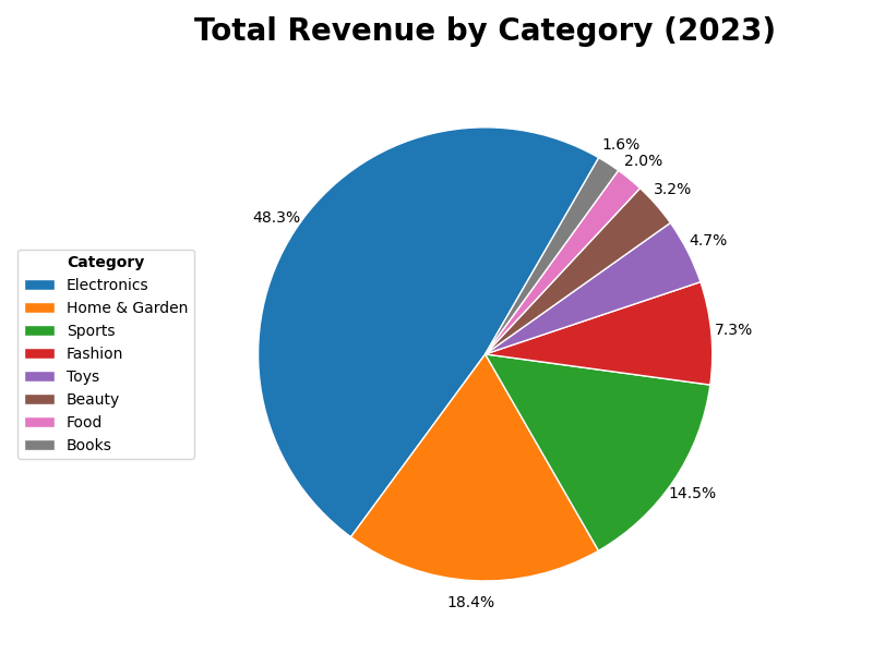 Revenue in 2023 was highly concentrated among a small number of categories. Electronics, Home & Garden, and Sports accounted for 81% of total revenue despite representing only 38% of units shipped.