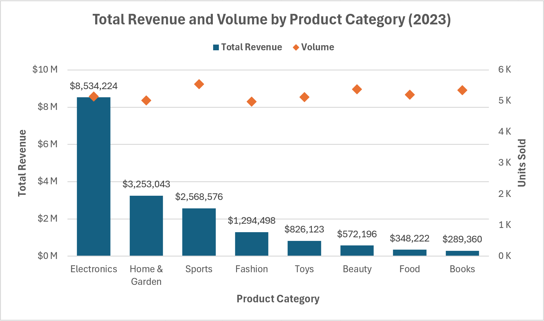 - Revenue concentration: Revenue is dominated by Electronics, Home & Garden, and Sports.