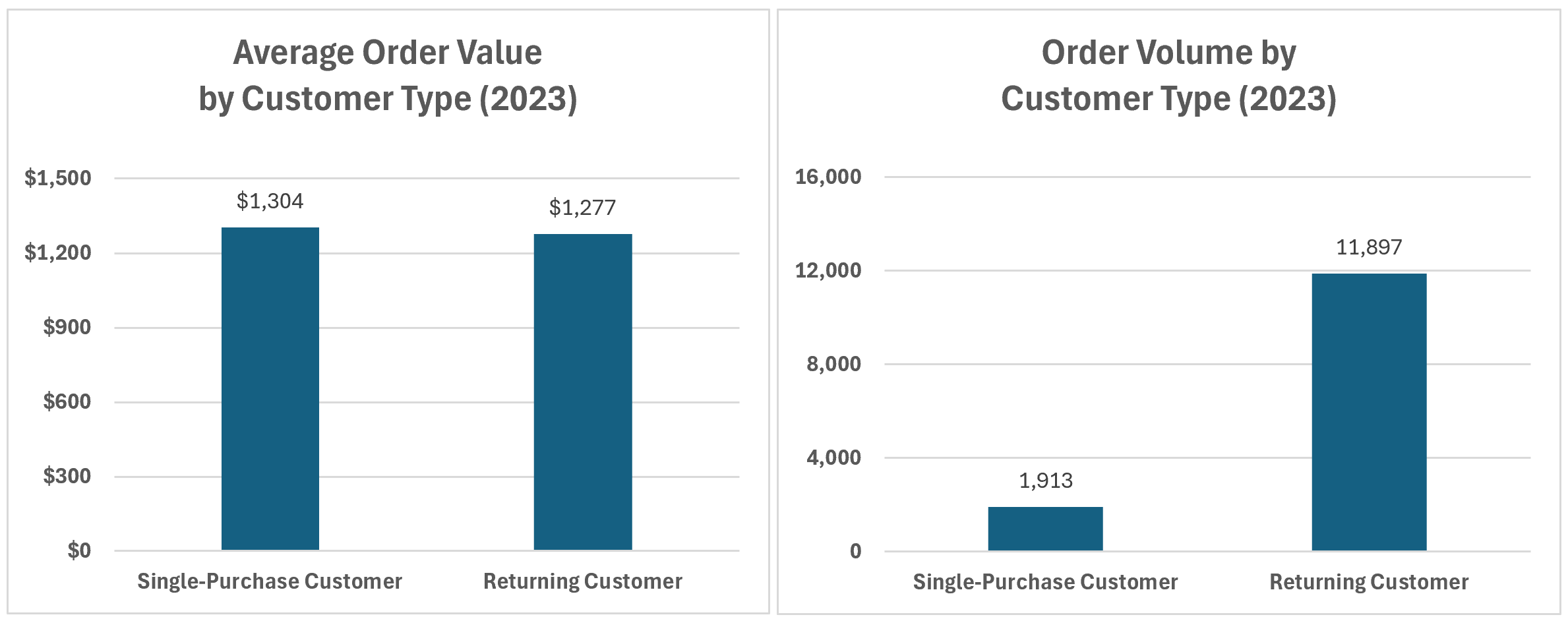Returning customers differ from single-purchase customers primarily in purchasing frequency, not spend per order. The average order value between the two groups differs by only $27, while returning customers place 6.2× more orders.