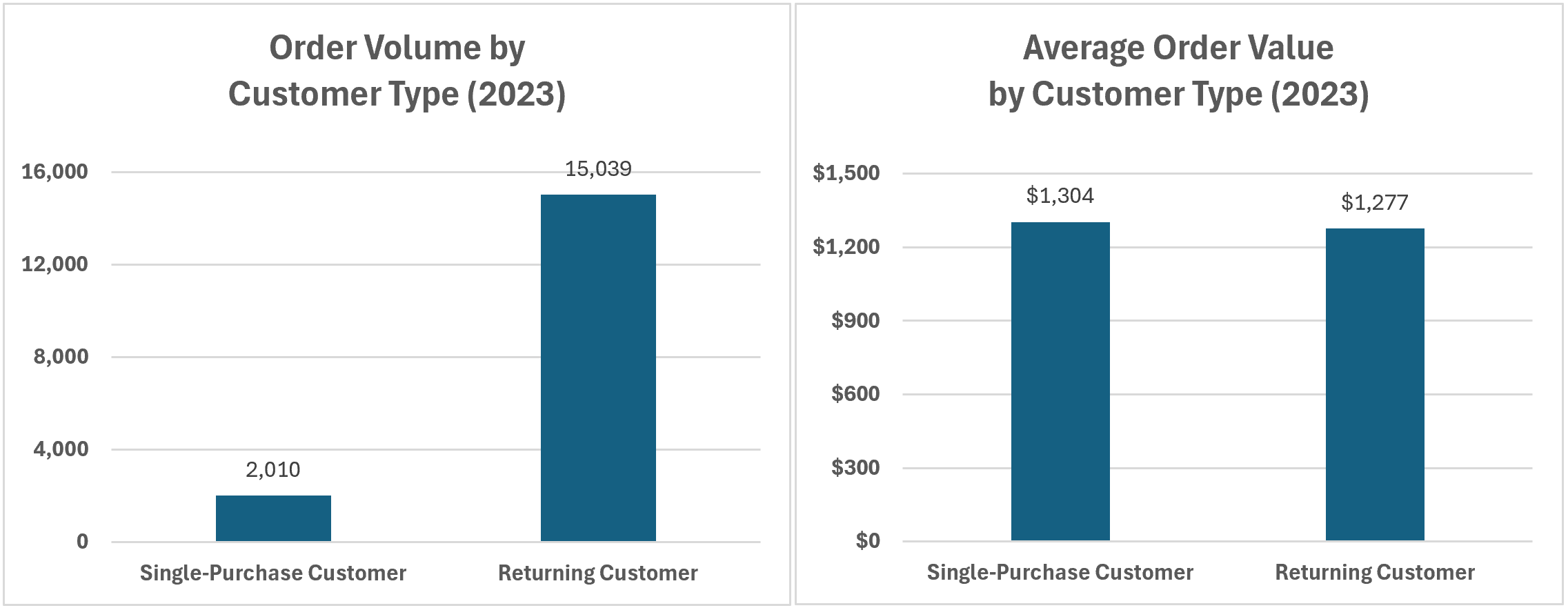 - Retention: Returning customers drive revenue primarily via higher purchase frequency.