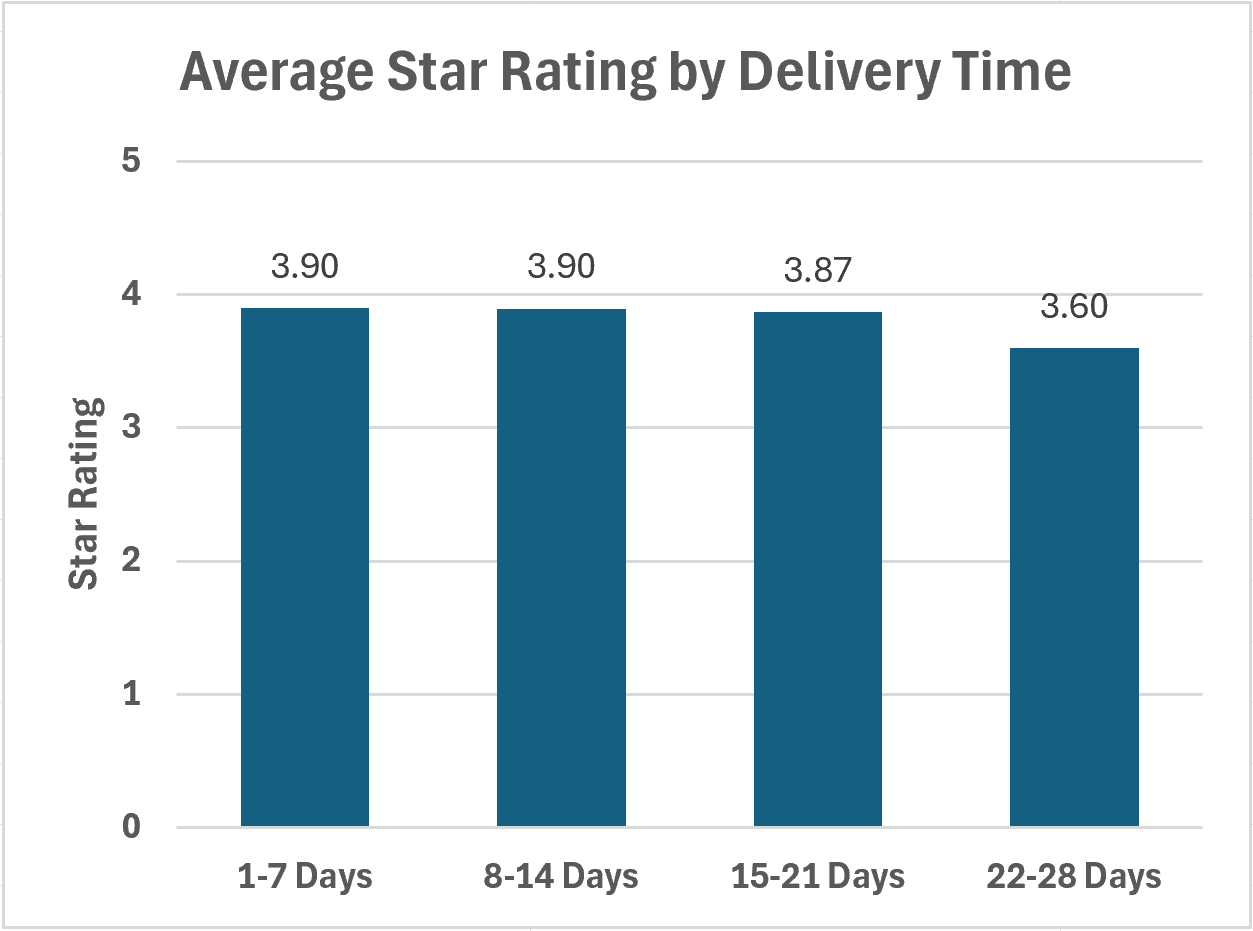 - Delivery: Delivery speed shows minimal relationship with customer ratings.