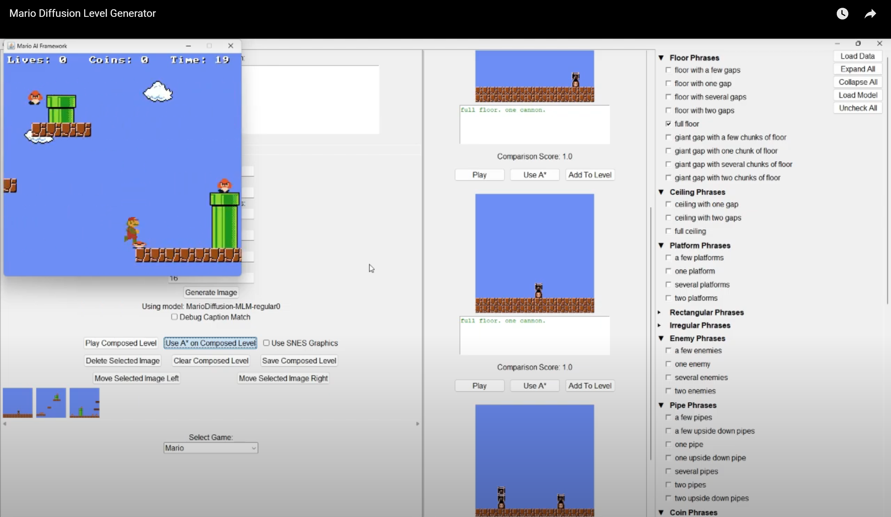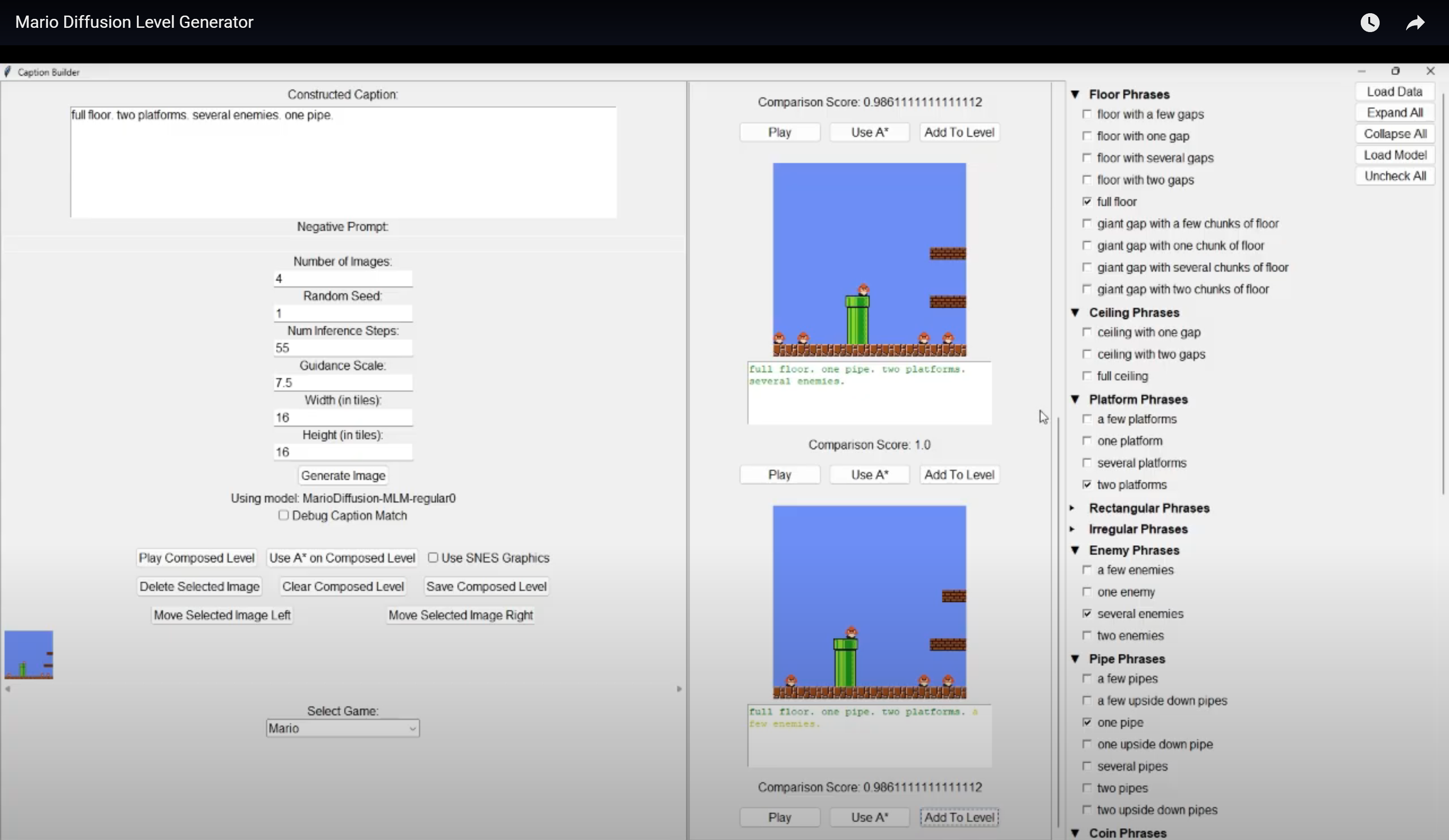 Trained diffusion models with UNet architecture for procedural content generation (PCG) in game level design, with optional text-based guidance. Contributed to model infrastructure (early stopping, checkpoint resumption), improved mixed-initiative tools for level building, and developed scripts to evaluate and visualize runtime and A* solvability metrics.